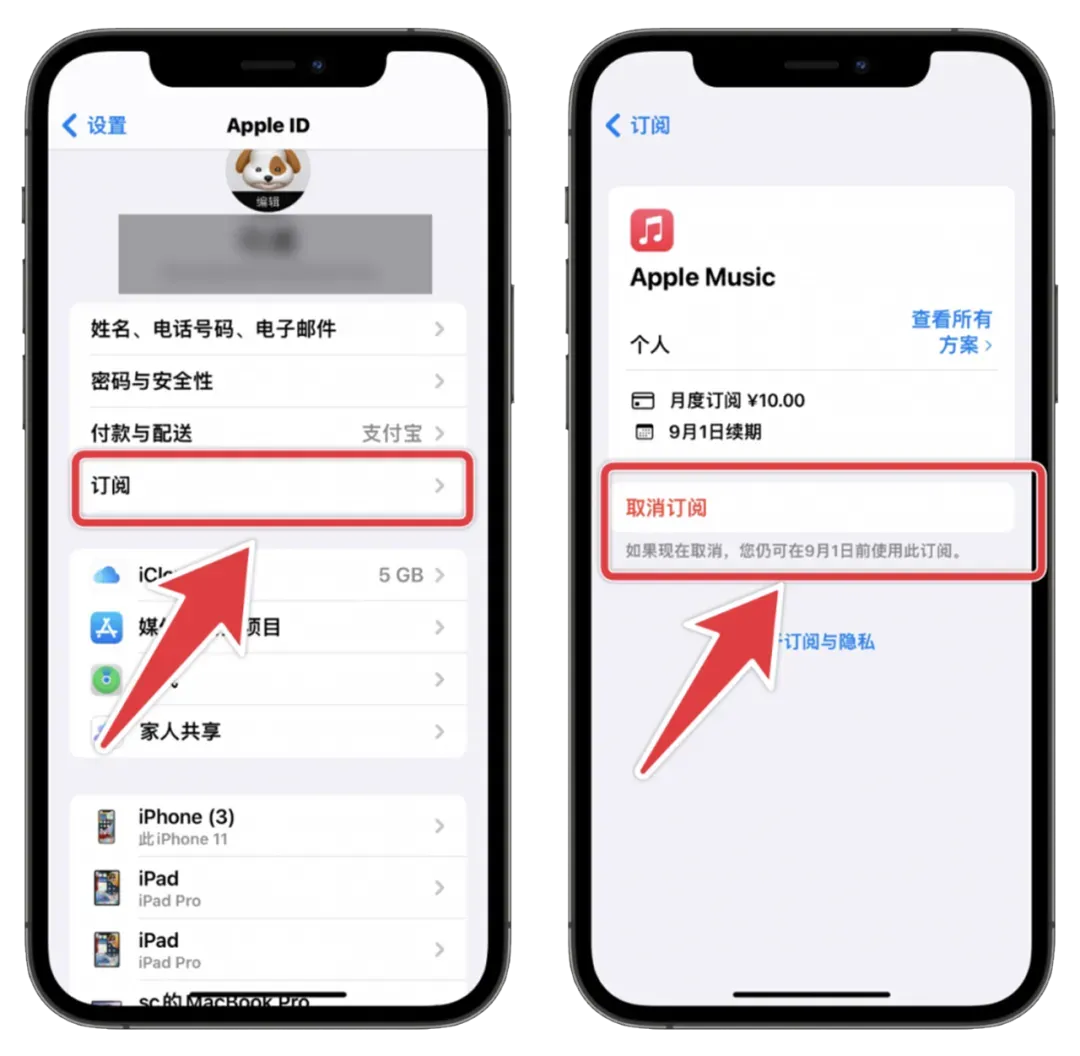 前往【设置】中点击顶部自身头像,在【订阅】内找到 Apple Music 进行取消订阅。在【取消订阅】按钮下方我们可以看到,“如果现在取消,您仍可在**月**日前使用该订阅”,也就是到期前会员权限不受影响正常使用。