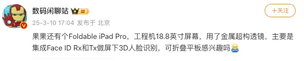 据微博爆料人数字聊天站称,苹果的一款工程原型机采用 18.8 英寸可折叠屏幕,配备“金属上层结构镜头”,集成了 Face ID 的接收器和发射器组件,可实现屏下人脸识别。该爆料人未提供其他信息。从产品形态来看,该设备延续了 iPad 系列的设计语言,但通过折叠结构实现了屏幕尺寸的跨越式提升。