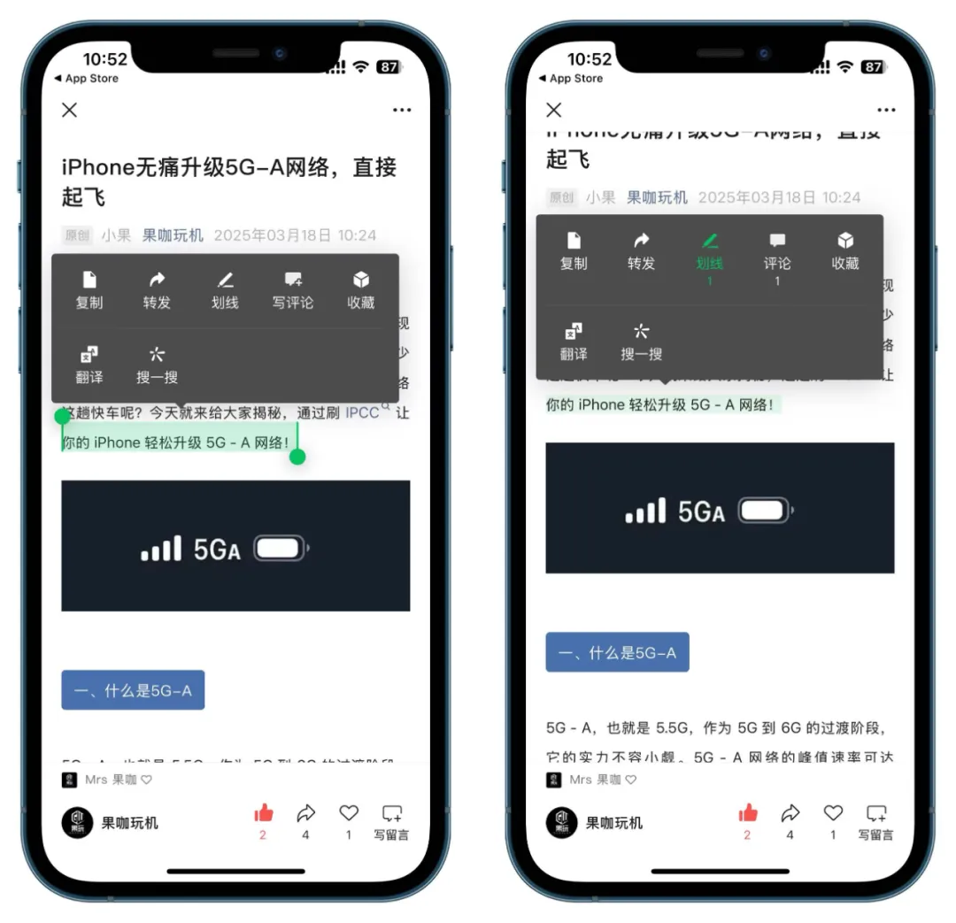 在微信 8.0.57 版本文章中,只要你选中文章中内容,你可以选择对此内容进行评论,并且会显示下划线,其他用户看到了,可以点击下划线可查看评论内容,也可以继续评论。
